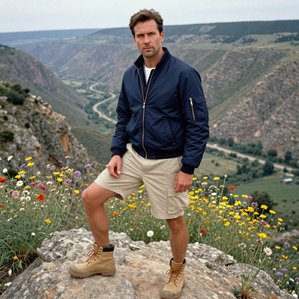 A man, navy blue bomber jacket, beige tactical shorts, desert boots, relaxed adventure style, rocky outcrop viewpoint, sweeping valley below, vibrant wildflowers, Cibachrome style, confident expression Man has masculine face and piercing eyes