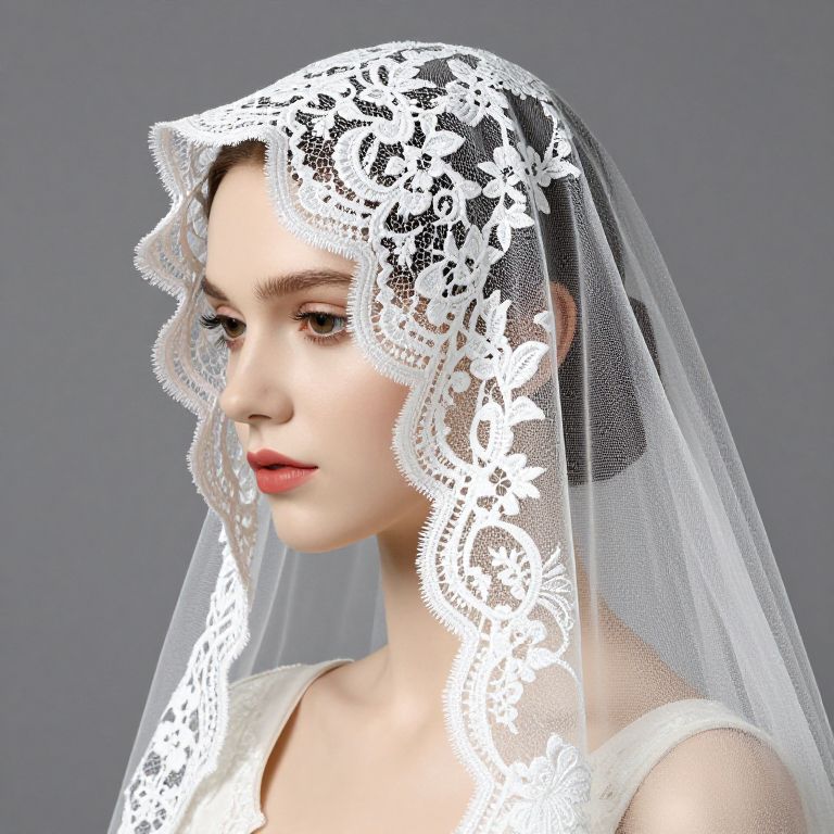 This is a digital CGI image of a young woman with fair skin and delicate features, wearing a white lace veil adorned with intricate floral patterns. The veil, which is semi-transparent and drapes over her head and shoulders, frames her face and reveals her red lipstick and downcast brown eyes. She is dressed in a white, sleeveless top. The background is a solid, muted gray, which contrasts with the bright white of the veil and top. The image focuses on her upper body and head, showcasing the detailed lace texture and her serene expression.
