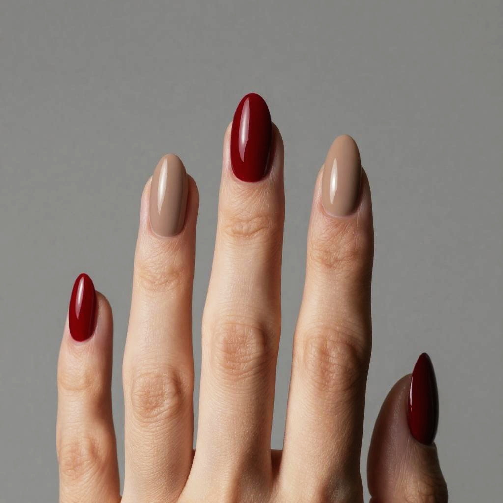 Close-up of a hand with a bold and sophisticated manicure featuring alternating deep crimson red and neutral tan nail polish shades. The nails are almond-shaped with a glossy finish, set against a plain monochrome gray background, highlighting the artistic nail design in sharp focus.