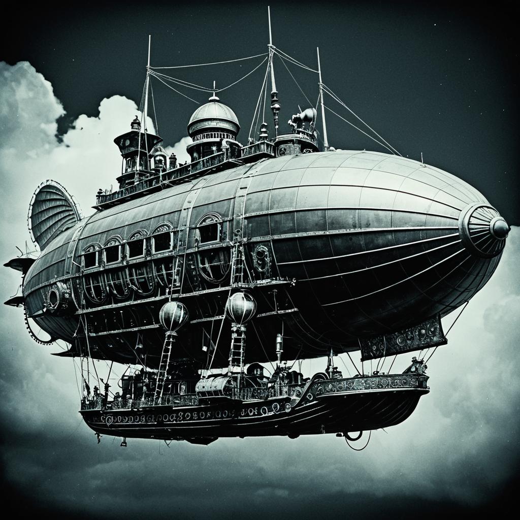 Detailed steampunk style airship featuring metallic textures, industrial design elements, and intricate architectural structures. The image is rendered in monochromatic tones with a serene, x-ray inspired aesthetic, emphasizing mechanical components and a vintage futuristic atmosphere.