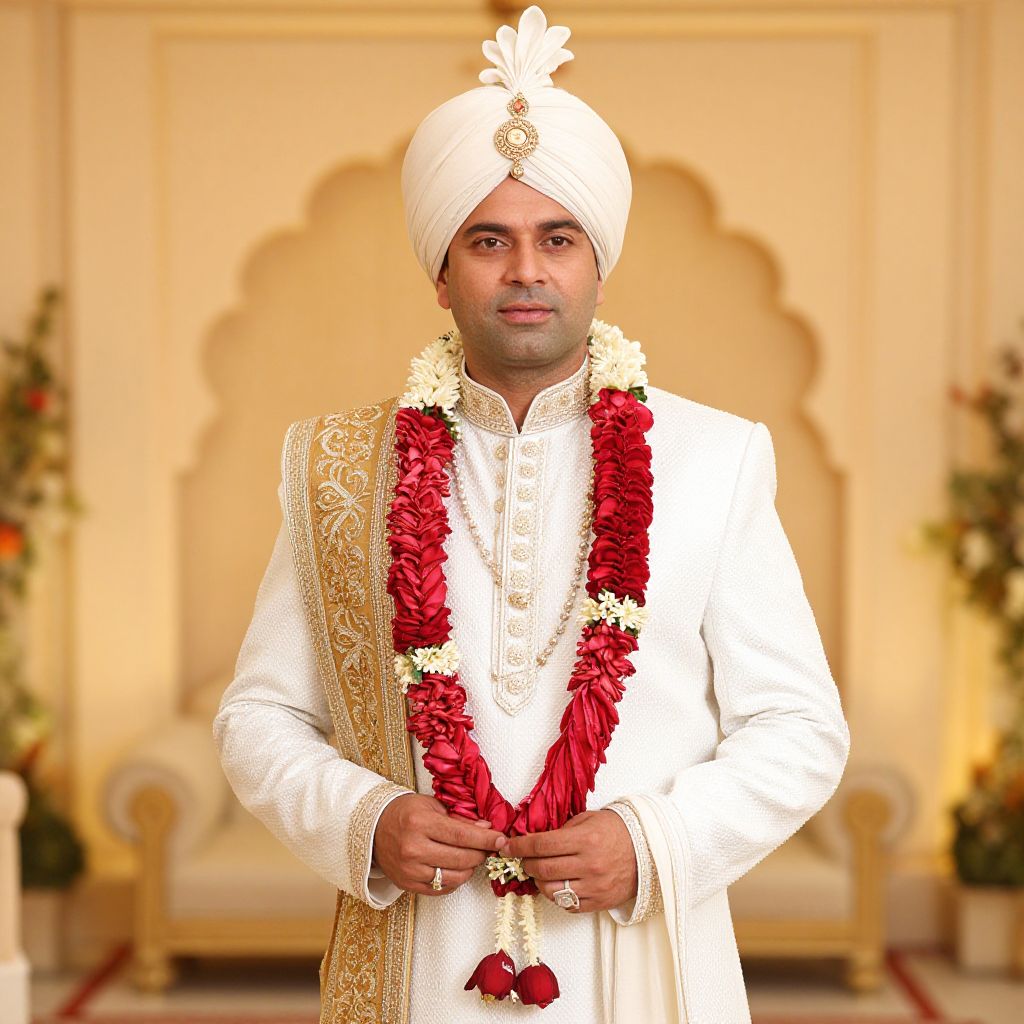 Photograph of a South Asian man standing in an ornate, cream-colored room. He wears a white traditional sherwani with gold embroidery, a white turban adorned with a gold emblem, and a long red and white marigold garland draped over his chest. His hands, which have gold rings on the fingers, rest at his waist. The background features an arched, decorative wall and potted plants on either side. The man has a medium brown skin tone, dark eyes, and a slight smile. The image has a bright, warm light, enhancing the traditional and festive atmosphere.