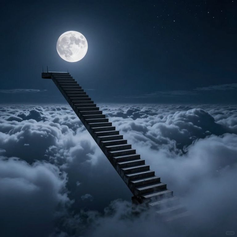 A moonlit staircase ascends through swirling clouds, defying gravity as it vanishes into the infinite expanse of night, leaving the viewer suspended between reality and dreams.