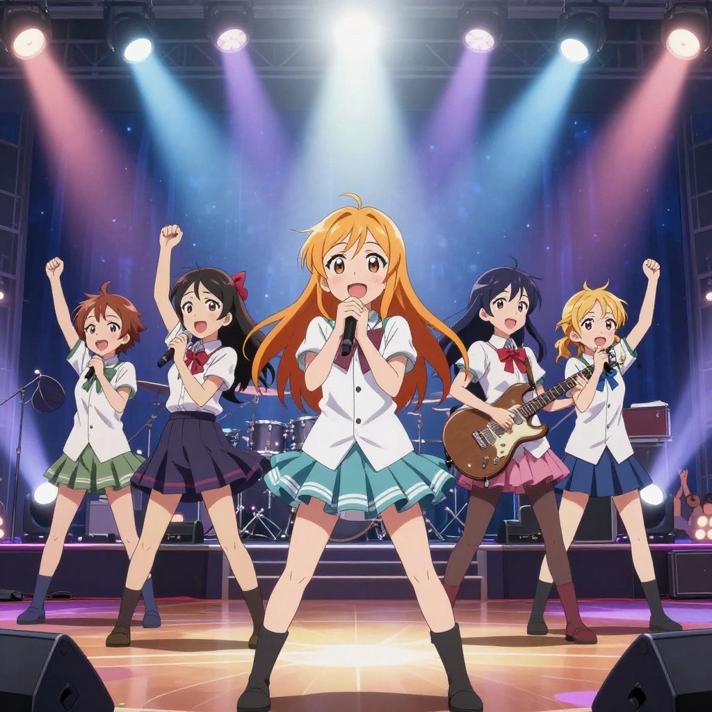 Love Live Nijigasaki characters in a dramatic concert scene, spotlights and cheering crowd, intricate stage design, expressive faces, dynamic movement, anime art