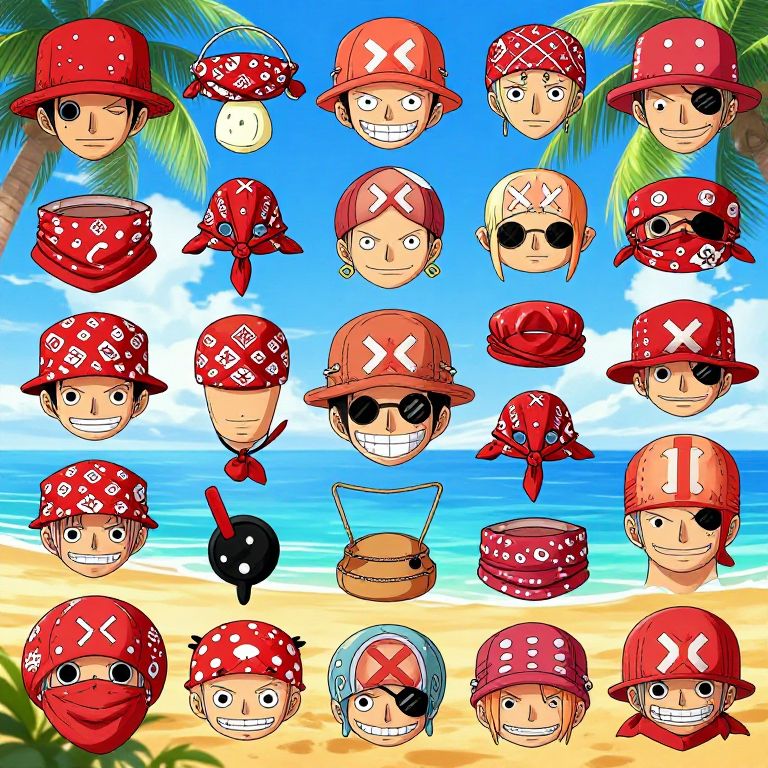 One Piece avatar maker inspired layout, anime character customization panel with tropical island backdrop, numerous accessories like bandanas, eye patches, and scar patterns, energetic and playful vibe, high saturation colors and intricate linework