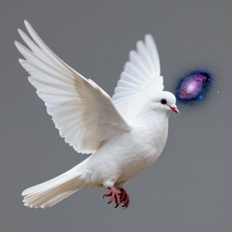 A single white dove carries a miniature galaxy in the grip of its wings, pollinating darkness with constellations wherever it lands.