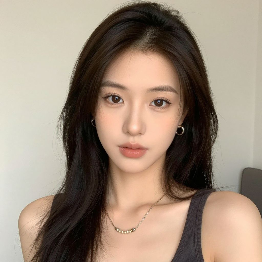 Photograph of an East Asian woman with long, straight, black hair and fair skin. She has large, almond-shaped brown eyes, subtle makeup, and full, pink lips. She wears a black tank top with thin straps, small hoop earrings, and a delicate gold necklace. The background is a plain, light-colored wall with minimal shadow, suggesting indoor lighting. Her expression is neutral, and the image is sharply focused, highlighting her smooth skin and delicate features.