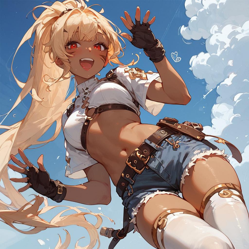 Score_9, score_8_up, score_7_up, source_anime, solo, 1girl, pokanliru, dark skin, whisker markings, happy, looking at viewer, waving, ponytail, o-ring top, beltbra, fingerless gloves, denim shorts, white thighhighs