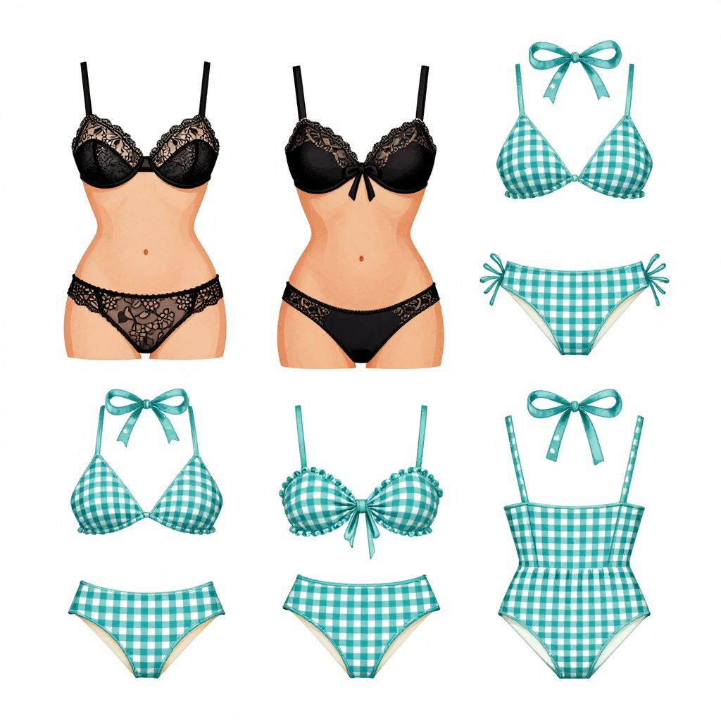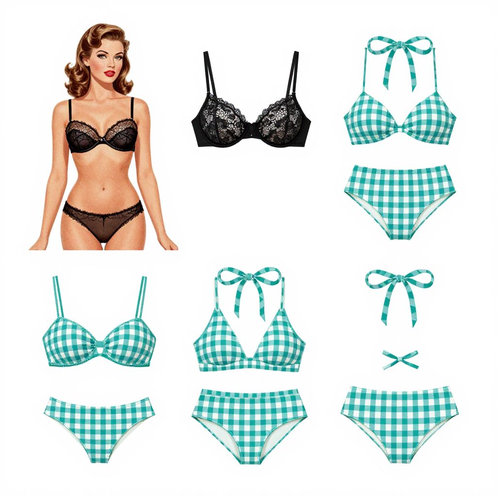 Vintage bikini patterns featuring a retro illustration of a woman wearing a black lace bra and matching bottoms, accompanied by four alternative designs in teal gingham with adjustable ties, evoke a nostalgic summer vibe.