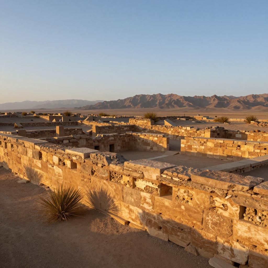Wide-angle view of ancient stone ruins situated in a desert landscape during a warm sunset. The setting sun casts a golden glow over weathered stone walls and archaeological remains, emphasizing the texture and structure of the site. Desert plants are scattered throughout, with distant mountain ranges under a clear sky framing the scene.