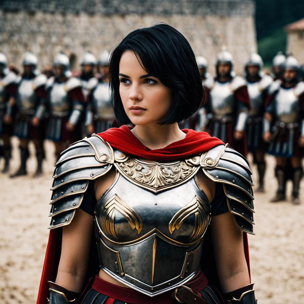 Close-up portrait of a young woman with long brown hair wearing polished medieval armor including breastplate, pauldrons, and chainmail. She stands confidently looking directly at the viewer with blurred knights in armor in the background. The setting suggests a medieval theme or historical reenactment.