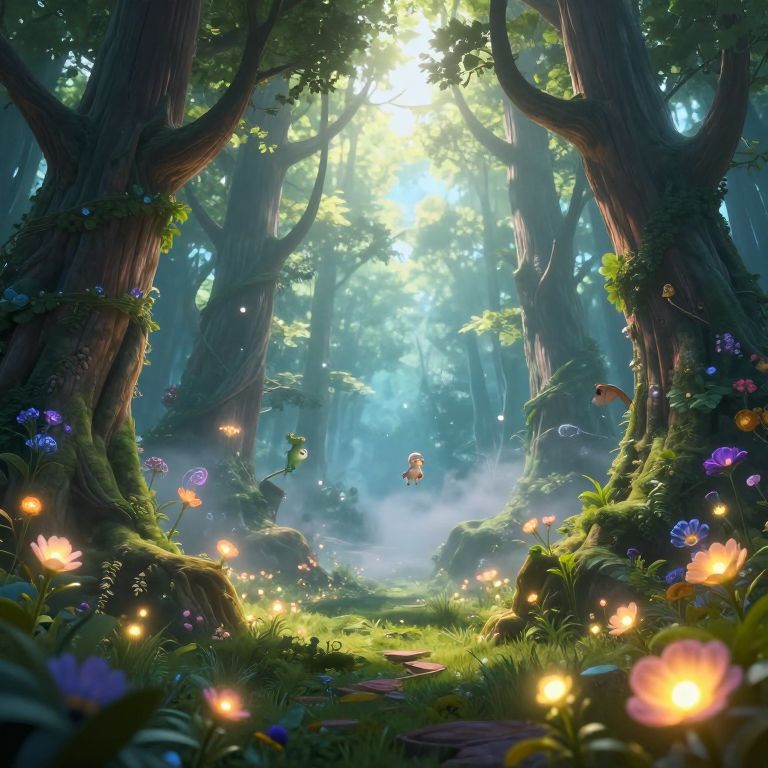 Digital art: Glowing, fiery cupcake with steam rising, suspended in enchanted forest with colorful mushrooms, lush greenery, and soft light beams.