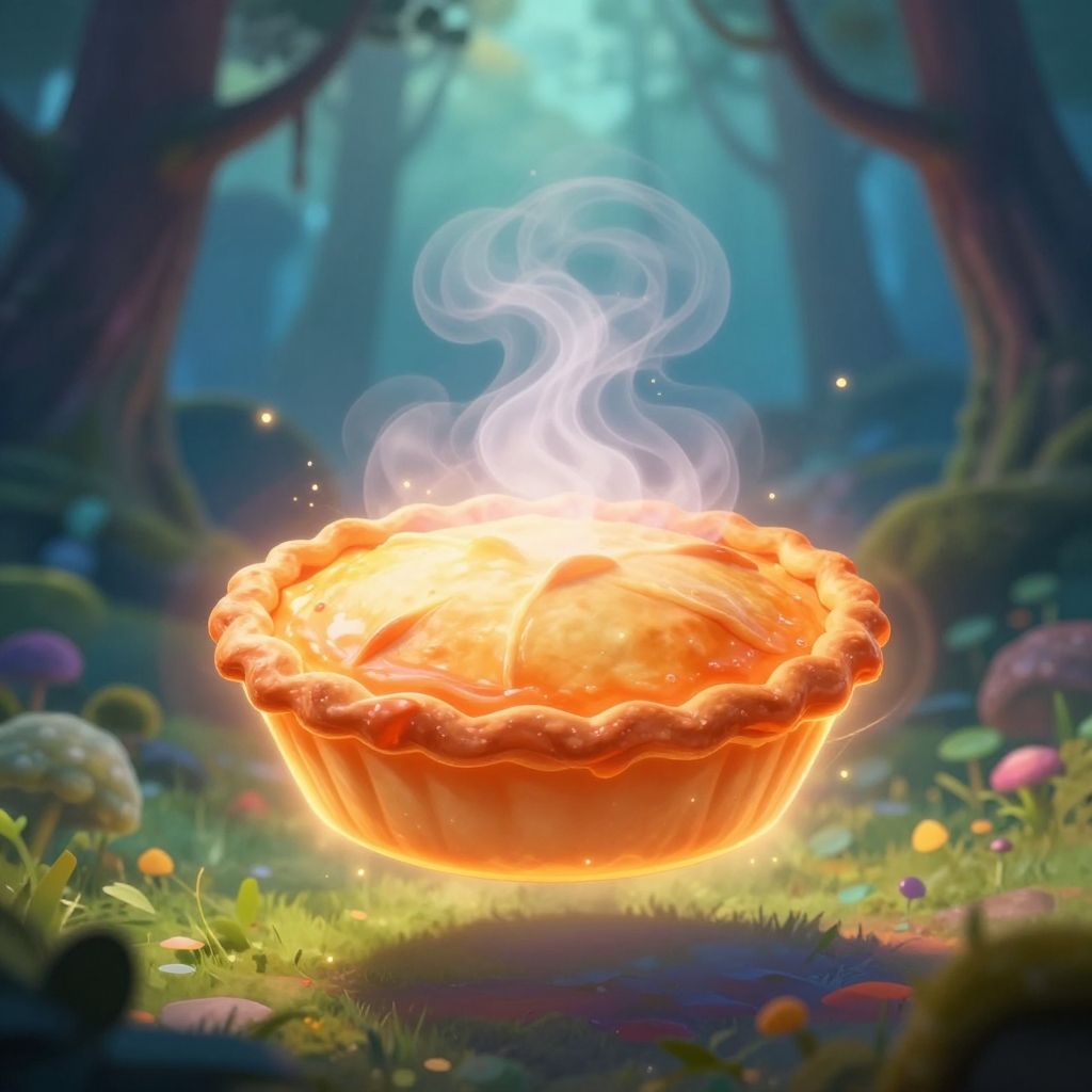 Drake floating pie suspended above a mystical forest, glowing magical aura, detailed steam rising from the warm pie, soft dreamy lighting, fantasy art style with vivid hues