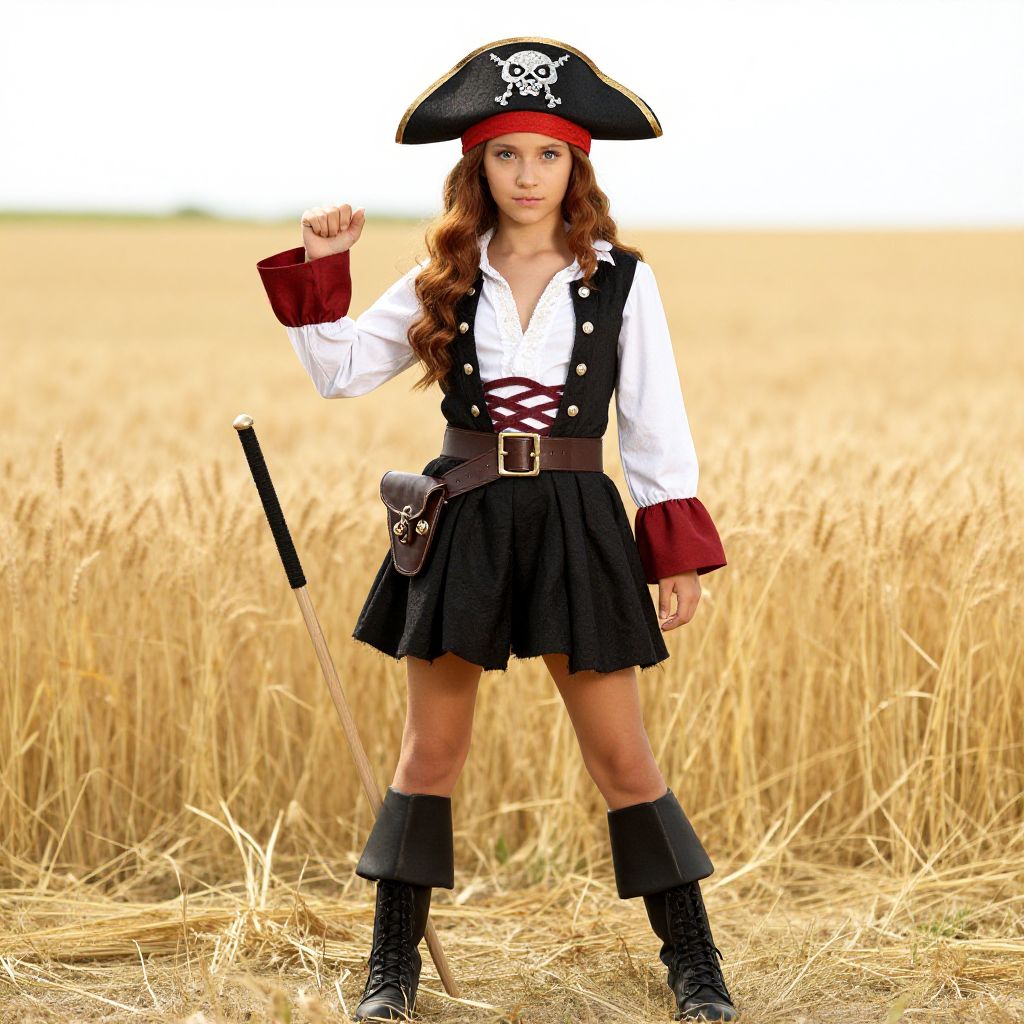 "Woman Small Pirate Costume, woman in pirate costume standing in a field of wheat"