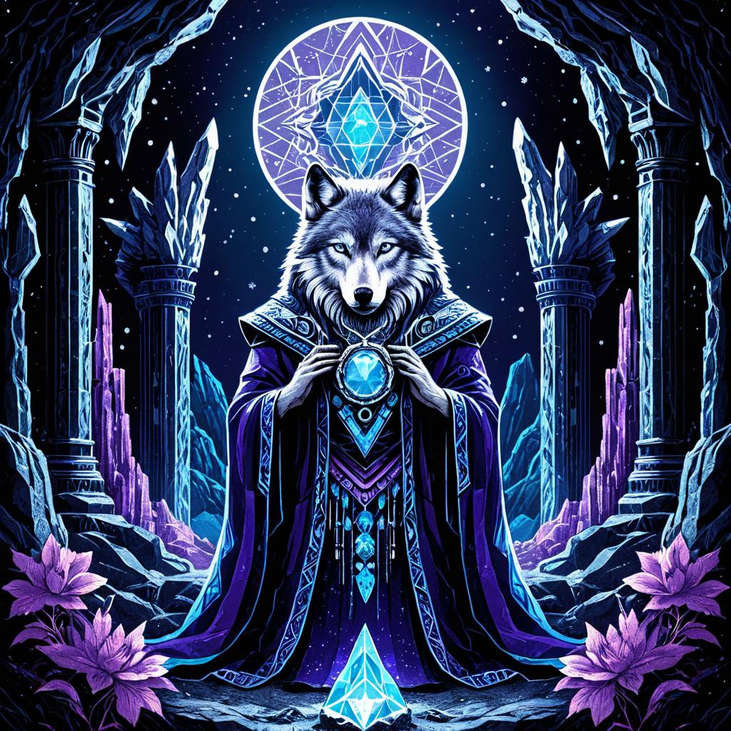 A moonlit wolf deity draped in elaborate embroidery glides through forgotten crystal cavern in a silver blue and deep violet palette, with vaporwave graphic design and angelcore elegance overlaid with scientific illustration motifs in ultra-high-definition 3840×2160.