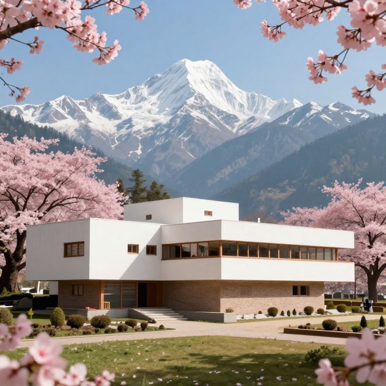 Space Planning Relimai Retreat, Kalimpong building image in the style of Frank Lloyd Wright, 3D, hyper realistic, beautiful, cherry blossoms, happy, himalayas, majestic,