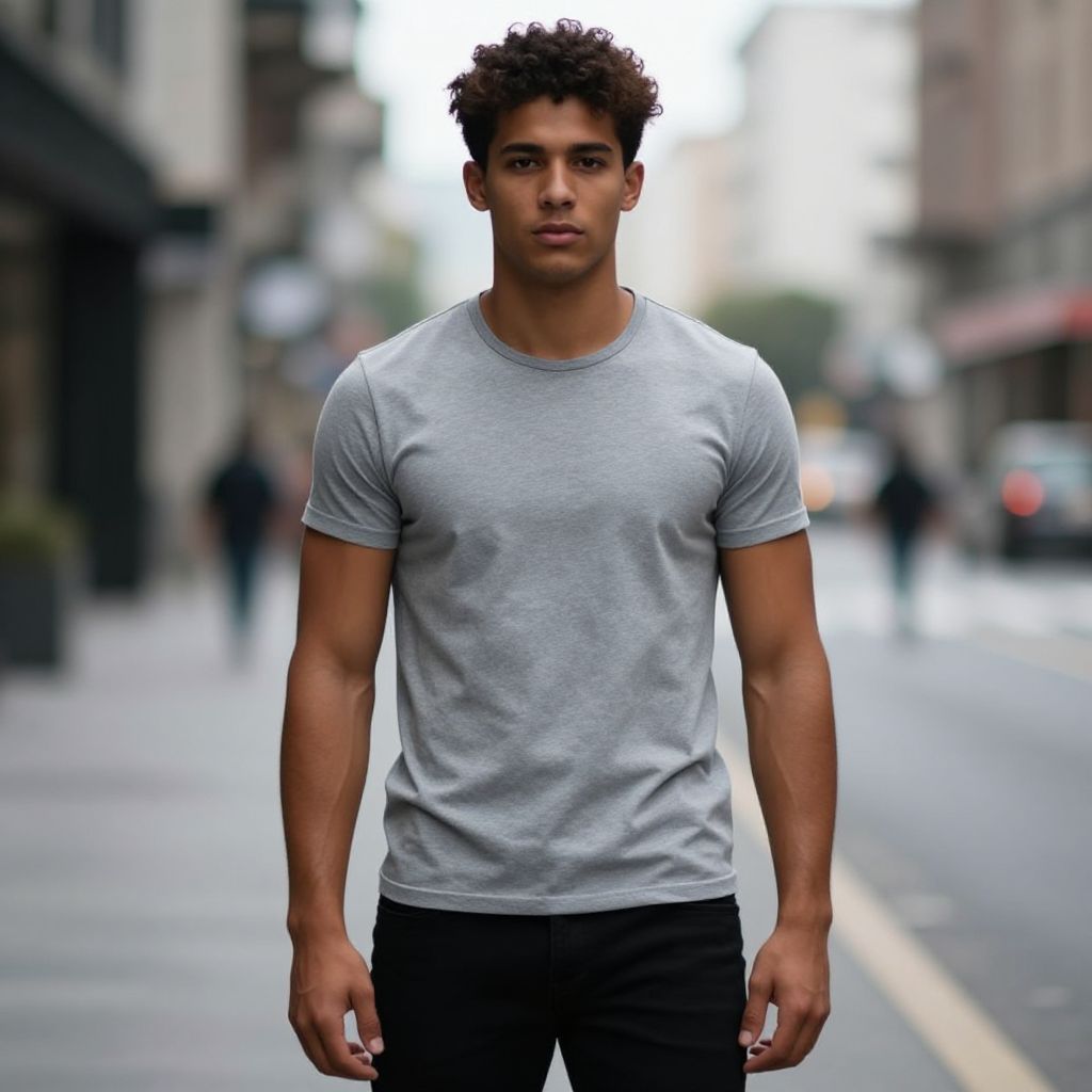 Photograph of a young man with medium brown skin and short, curly dark brown hair standing on a city street. He's wearing a fitted, grey, short-sleeved t-shirt that highlights his toned arms and black pants. His expression is neutral, and the background is slightly blurred, showing an urban setting with buildings and people in the distance. The image has a modern, slightly dramatic feel.