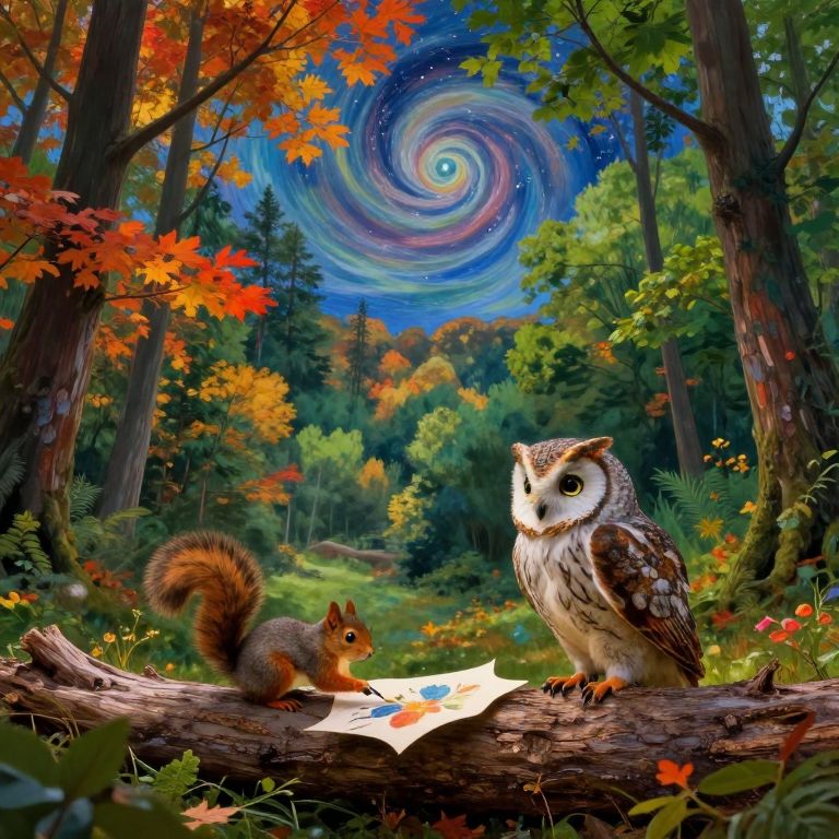 A captivating photorealistic image combines an enchanted forest with a swirling sky reminiscent of impressionist masterpieces. The scene features vivid autumn colors contrasting lush green foliage and star-dappled heavens as if merged into one magical landscape. A wise owl observes an endearing squirrel creating art on a fallen log, evoking tranquility and wonder in equal measure. This whimsical juxtaposition invites the viewer to step into this enchanting world, where nature's dance of light and color captivates the senses.