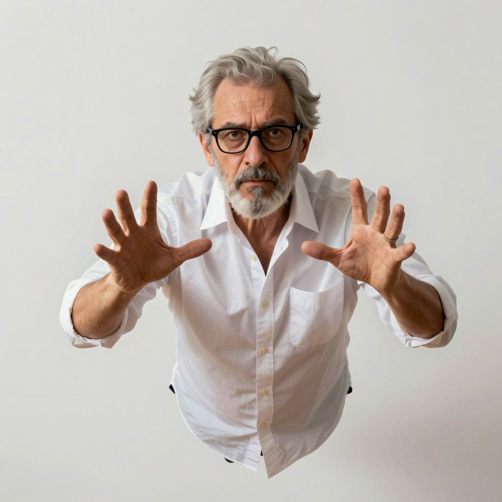 Middle-aged man with dark hair, white shirt, and black suspenders, smiling widely with a lit cigar in his mouth. Background is blurred with warm, brown tones. Man's face is centered, eyes wide, and teeth exposed. He holds a lit match in his right hand.