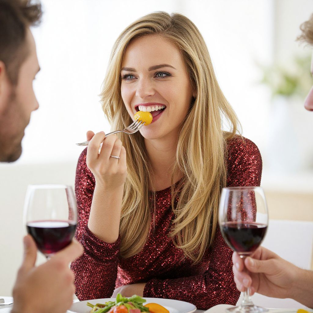 Photograph of a blonde woman with long hair, wearing a shimmering red long-sleeve top, smiling while eating a piece of orange food with a fork. She is sitting at a table with a man whose face is partially visible, holding a glass of red wine. The woman also holds a glass of red wine. In the foreground, there is a plate with a green salad and an orange slice. The background is brightly lit with a white, blurred window, giving a fresh and airy feel to the setting.