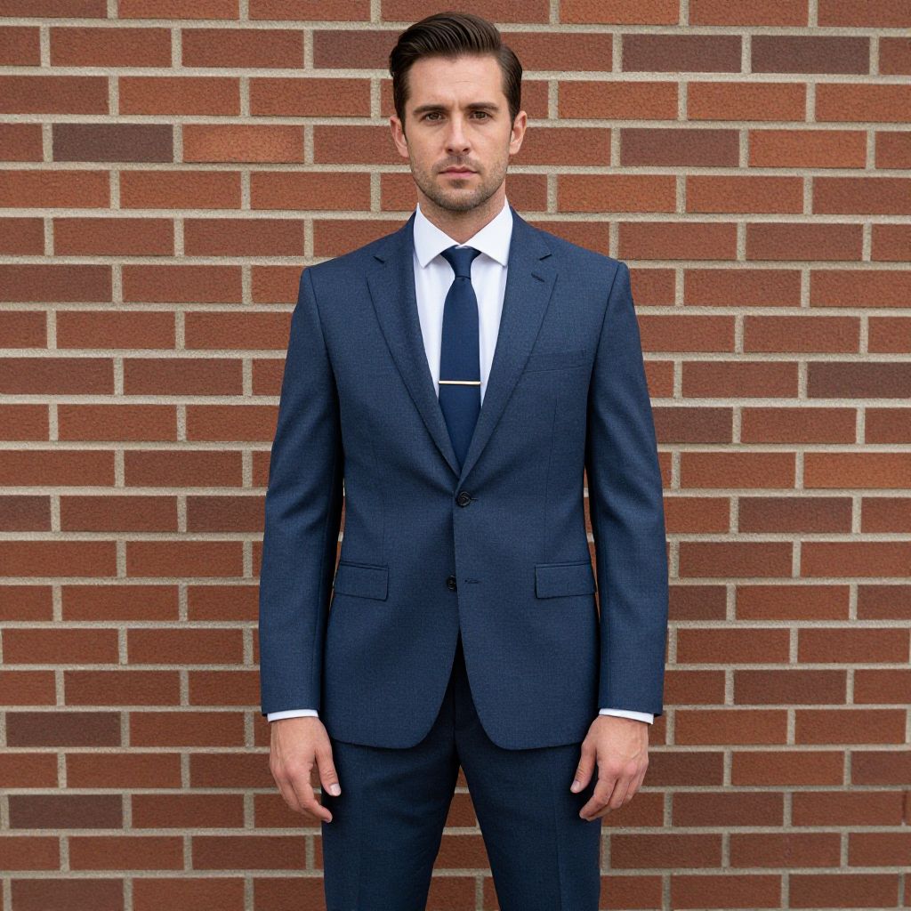 Photograph of a young, white man with light skin and short, dark brown hair, standing against a red brick wall. He is wearing a dark navy blue, single-breasted suit with a white dress shirt and a black tie. His expression is neutral, and he has a clean-shaven face. The suit jacket is slightly tailored, and the tie is neatly knotted. The red brick wall in the background has a traditional pattern with white mortar lines. The man's stance is straight, with his hands relaxed at his sides. The lighting is even, highlighting the textures of the suit and brick wall.