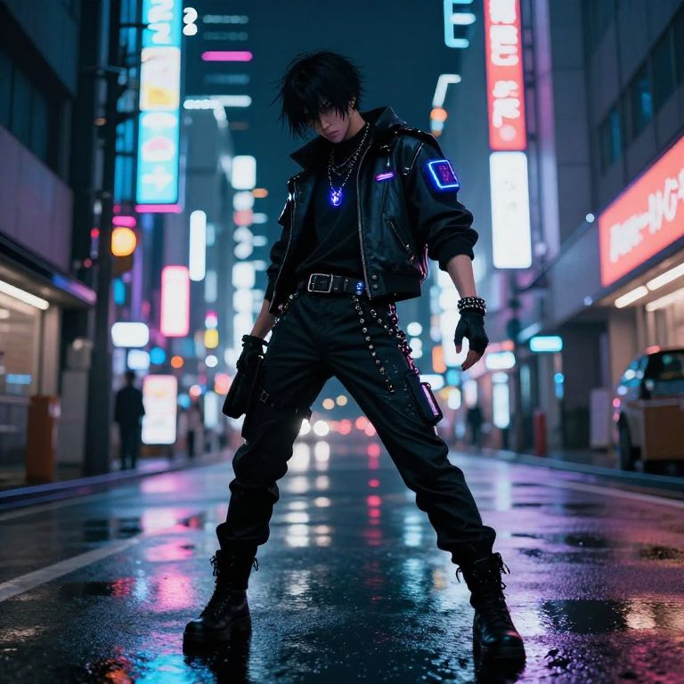 Cyberpunk night scene: Dark-haired man in black leather jacket and pants, neon-lit city street, wet pavement, glowing signs in background.