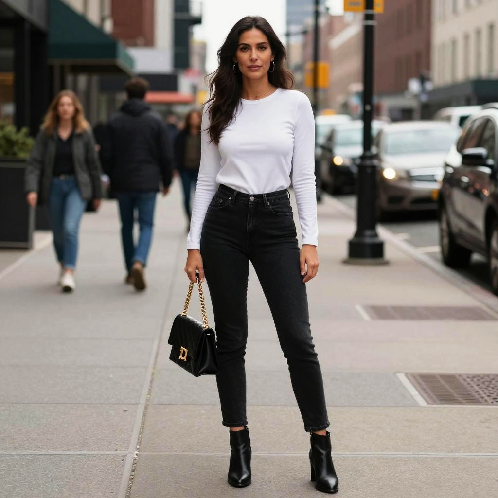 Photograph of a stylish woman with long black hair, wearing a white long-sleeve top, black high-waisted jeans, black ankle boots
