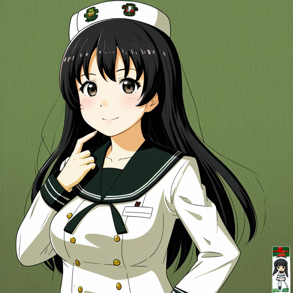 Murakami (girls und panzer), girls und panzer, 1girl, black eyes, brown eyes, long hair, black hair, large breasts, ooarai naval school uniform, dixie cup hat, long sleeves, sailor, by artist dduck kong, anime