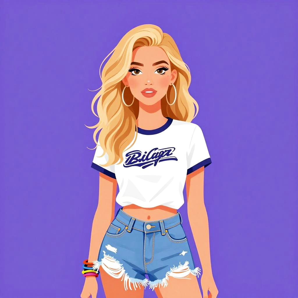 Woman with pretty face and pretty hair. Woman, casual, white crewneck t-shirt with navy blue trim on sleeves and collar, graphic print on chest, frayed denim shorts with distressed details, high-waisted, multiple bangles on one wrist, wavy blonde hair, light makeup. --sref 1461