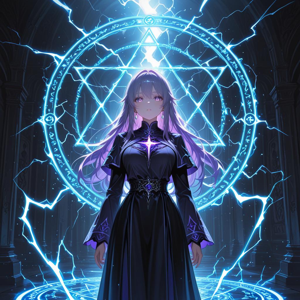 1girl, purple hair, symbol-shaped pupils, goddess of lightning, thunder, glowing, magic circle, backlighting, light particles, light rays, wallpaper