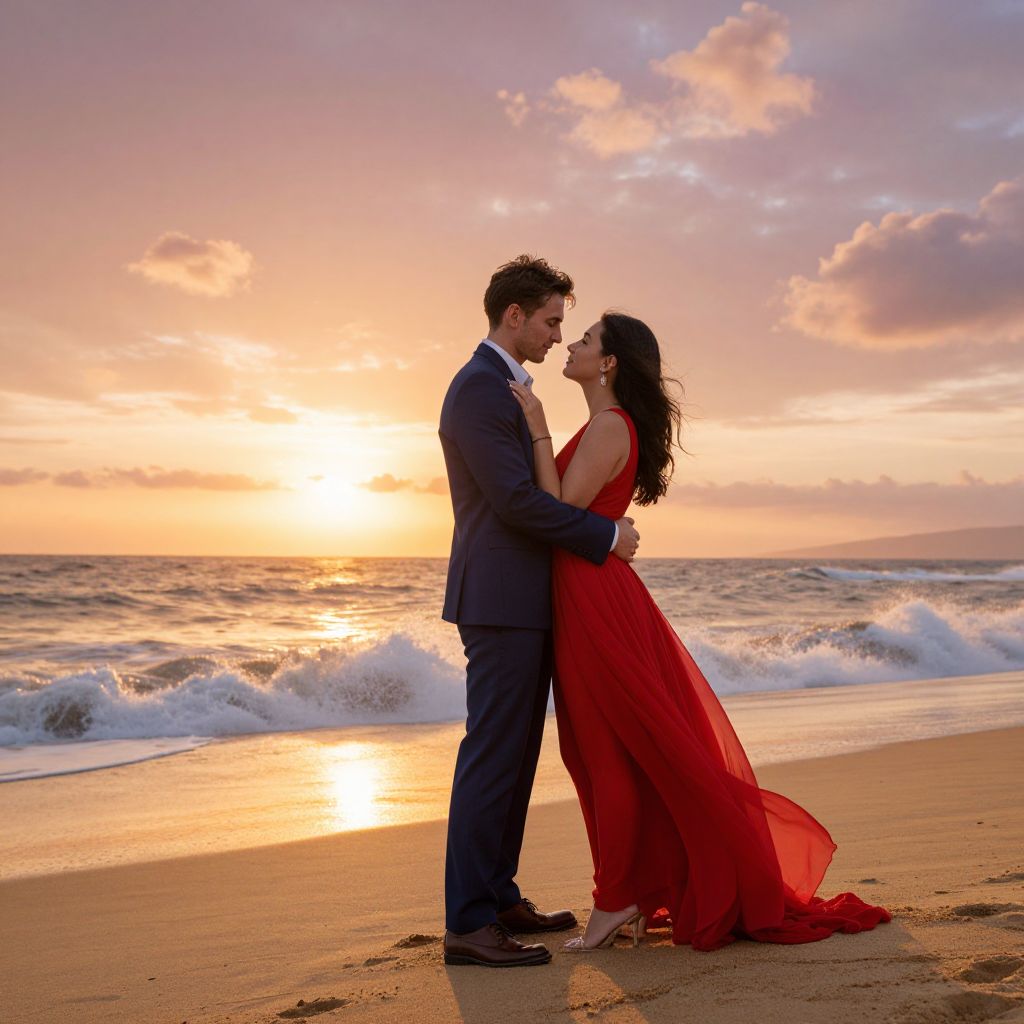 Romantic couple embracing on a golden beach at sunset, with the man in a navy suit and the woman in a flowing red dress, as waves gently crash behind them under a vibrant sky.