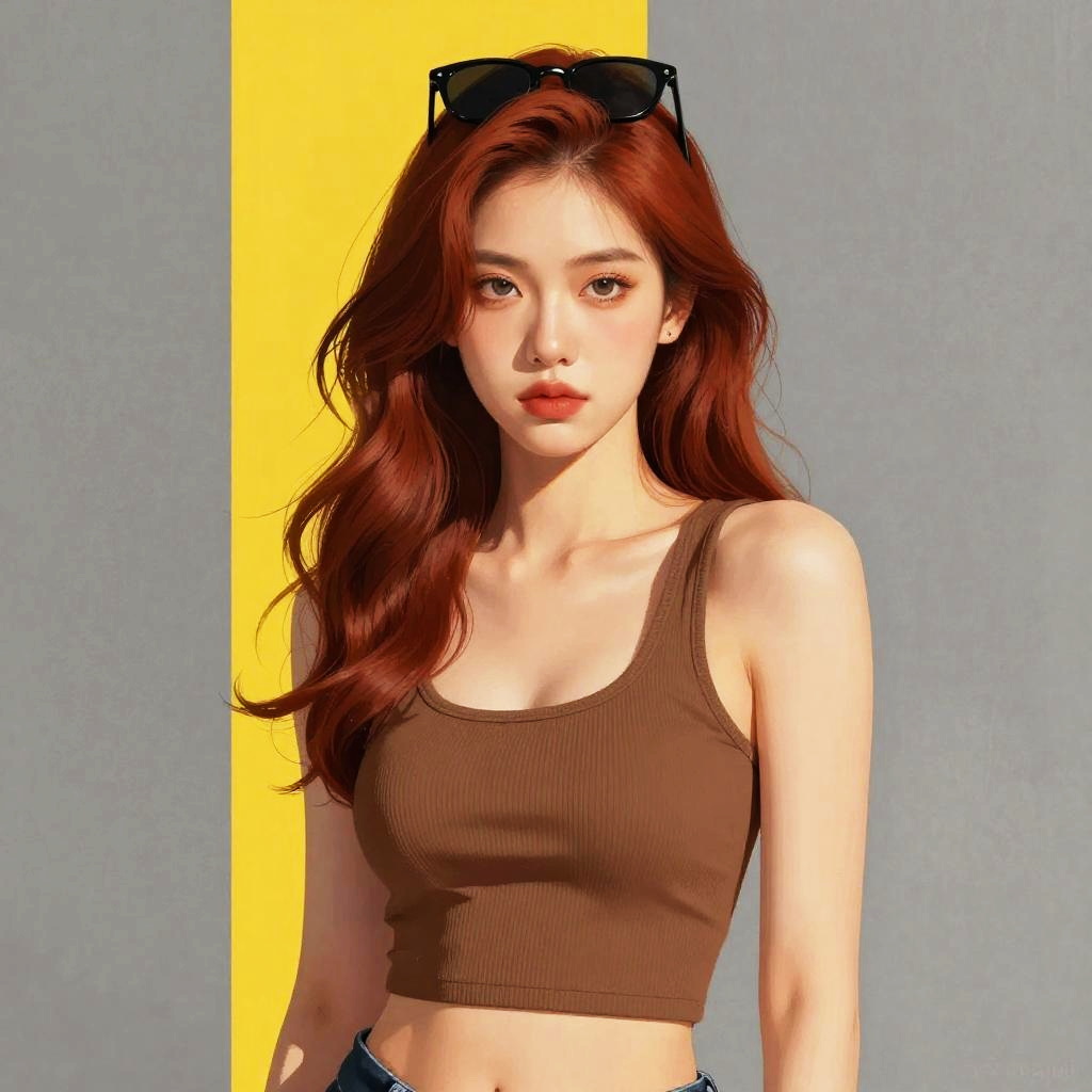 This is a digital illustration of a young woman with fair skin and wavy auburn hair, wearing a brown ribbed crop top that reveals a hint of her cleavage. She has a serious expression and is standing against a bright yellow vertical stripe, with a grayscale, textured wall behind her. Her sunglasses rest on top of her head. The overall style has a modern, edgy feel.