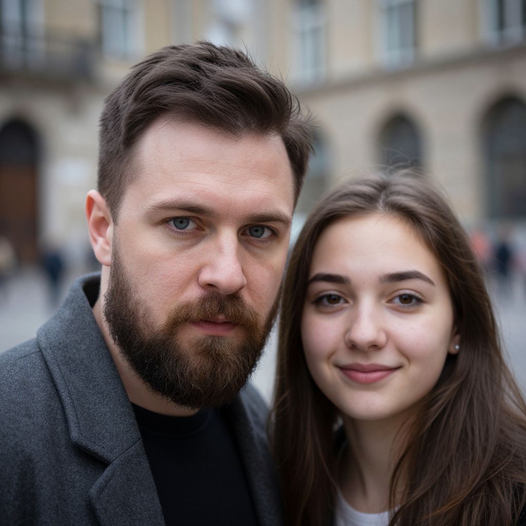 Photograph of a bearded man with dark brown hair and intense blue eyes in the foreground, wearing a gray jacket. He's slightly to the left, with a smiling young woman with long brown hair and light skin to his right. The background is a blurred urban setting with stone buildings. The image has a slight vignette effect, focusing on the subjects' faces.