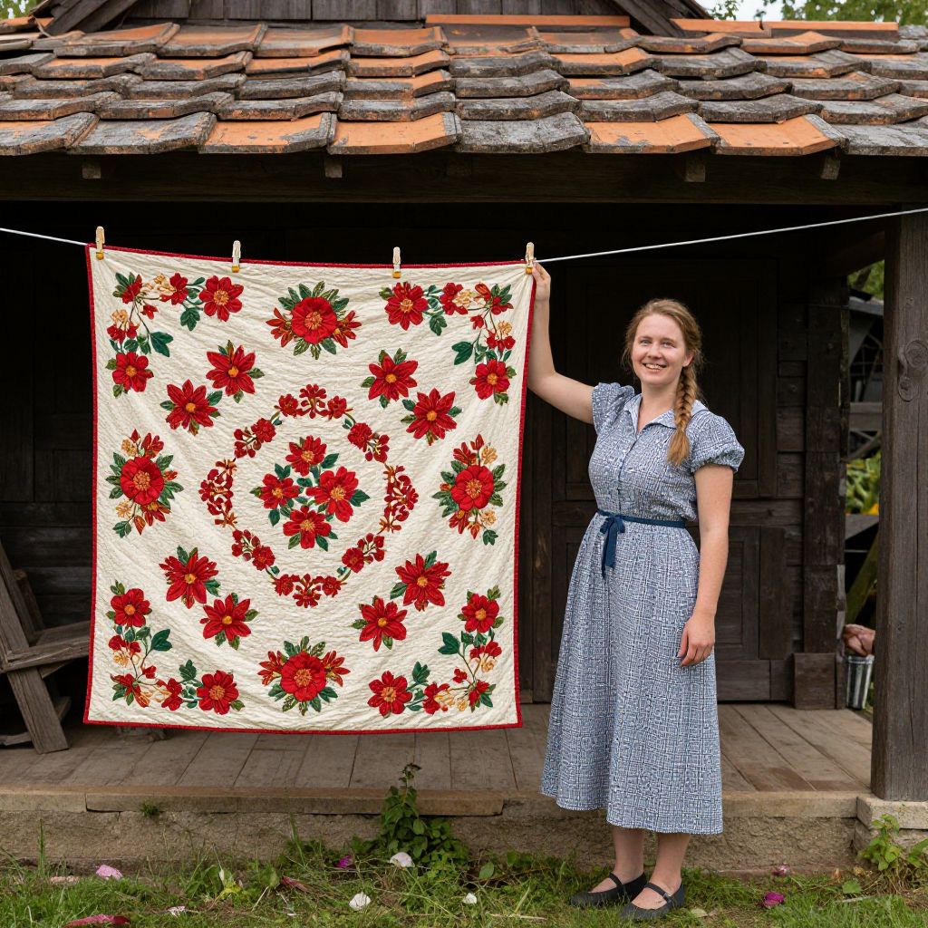 Farmwoman stands outdoors, proudly displaying a handmade quilt featuring vibrant red floral patterns against a cream background, suspended from a clothesline beside a rustic wooden cabin with weathered orange tiles.