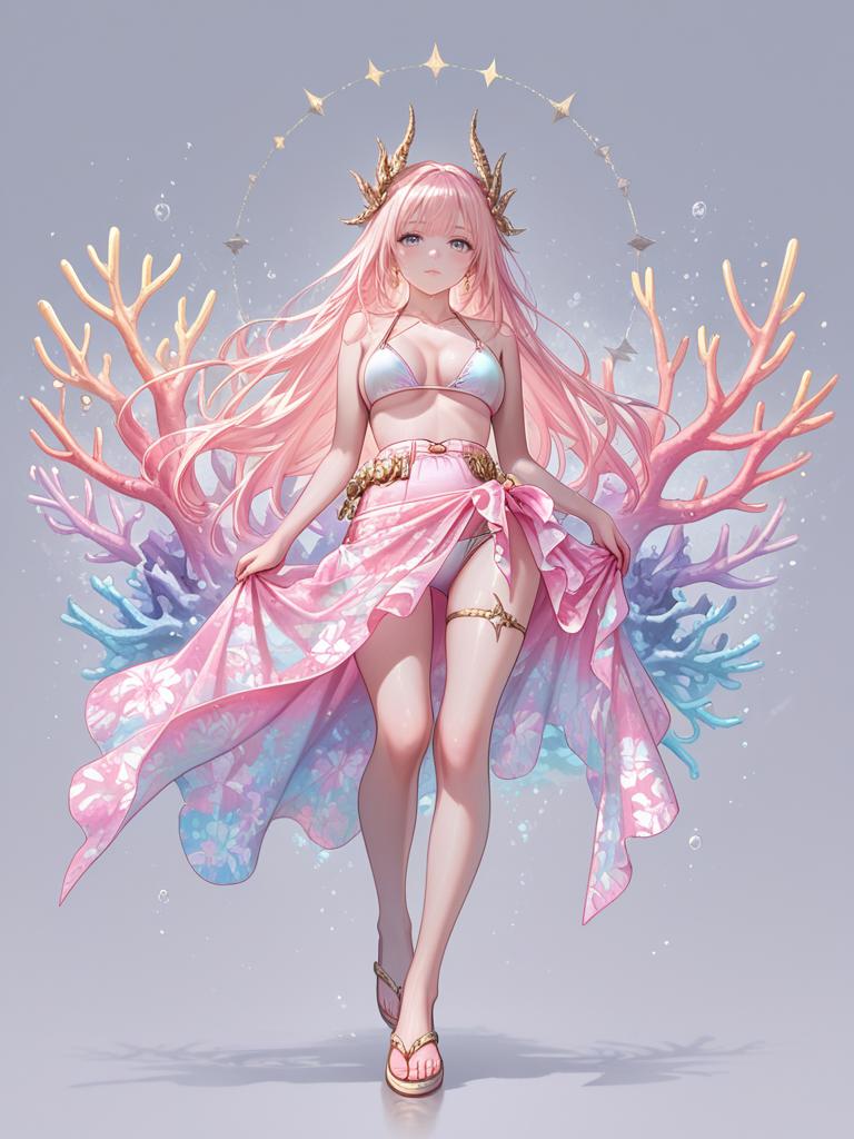 1girl, realistic face, Triangle bikini, vibrant coral color, soft nylon fabric, adjustable straps, gold hardware accents, high-waisted sarong, lightweight chiffon, tropical floral print, matching flip-flops, rubber sole, embellished with seashells.