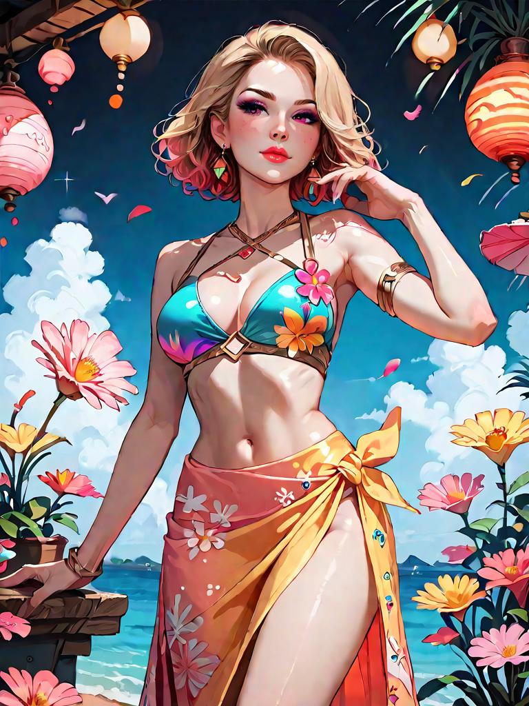 Digital illustration of a woman with short blonde hair wearing a vibrant coral-colored realistic triangle bikini with adjustable gold hardware straps. She is styled with a high-waisted chiffon sarong featuring a tropical floral print, tied at the hip. The scene includes tropical flowers, decorative lanterns, and a bright blue ocean background, conveying a summery beach vibe.