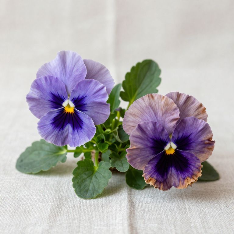 A botanical studio setup with two adjacent pansies on a linen background—one in full bloom with tender, soft green leaf veins and vivid purple petals, the other wilted and curled, showing visible dried textures, brown edges, and papery fragility, set against a neutral backdrop with soft ambient lighting to highlight the contrast between freshness and decay.