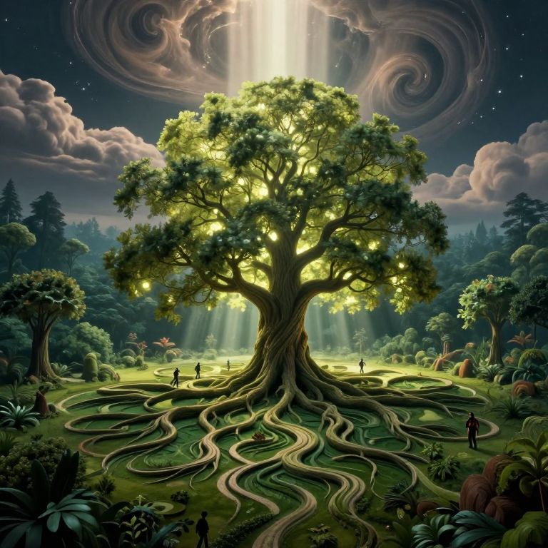 Immerse in a captivating surrealist landscape where a majestic tree with luminescent foliage illuminates a magical glade, its roots forming complex patterns reminiscent of Escher-like drawings, weaving through an intricate forest floor. From above, celestial beams pierce a dramatic sky filled with swirling vortexes and ethereal clouds, casting surreal shadows onto the verdant landscape below. This dreamlike vista evokes wonder and intrigue as curious explorers traverse this otherworldly paradise where nature intertwines with the impossible to create a mesmerizing visual symphony.