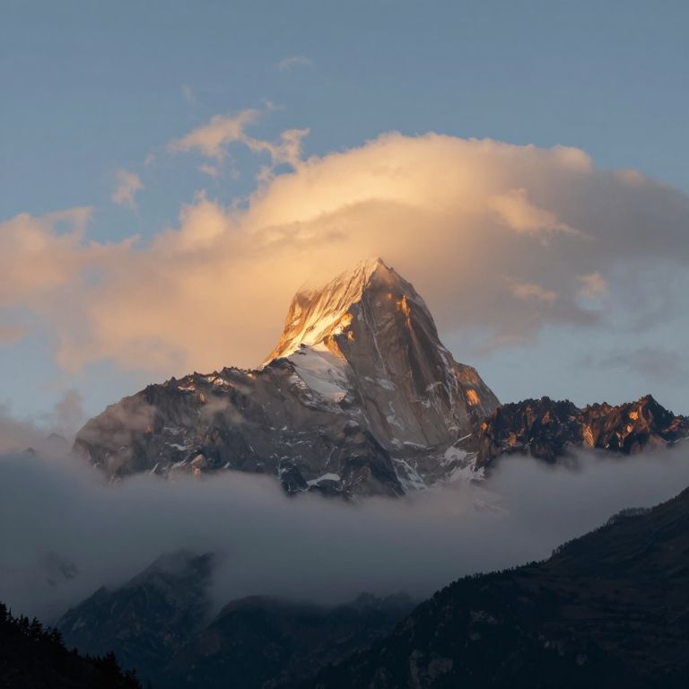 Photograph of a sunlit, snow-capped mountain peak glowing golden, shrouded by clouds, with dark forested slopes in the foreground.