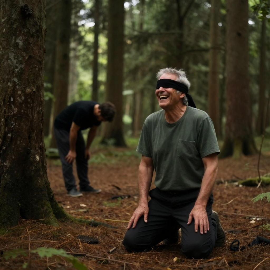 Photograph of a forest with tall trees. In the foreground, an older man with a blindfold, green shirt, and black pants kneels on the ground, laughing. In the background, another man in black bends over, partially obscured by trees. Sunlight filters through the trees, creating dappled light on the forest floor.