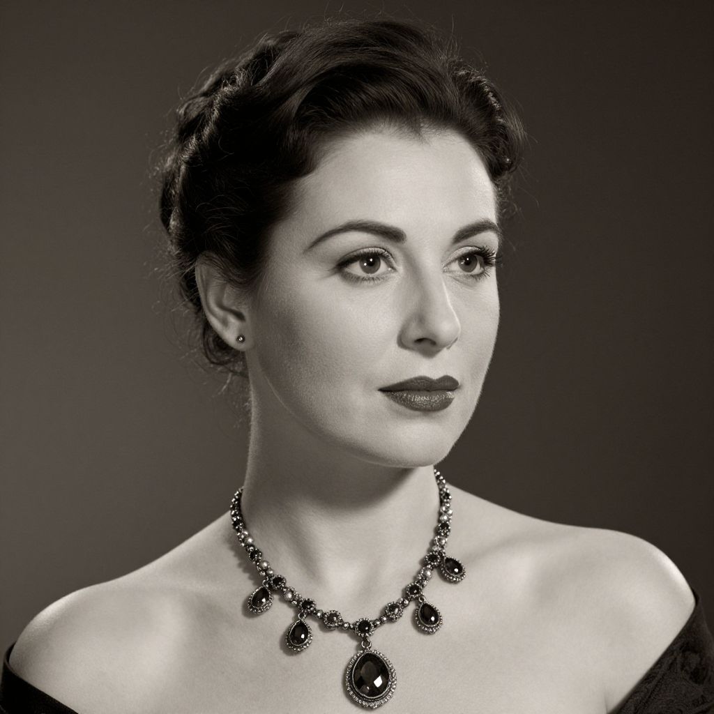A black-and-white photograph of a poised woman with fair skin and dark, elegantly styled hair. She wears a black off-shoulder top and a statement necklace with large, ornate oval pendants. Her dark lipstick contrasts with her light complexion, and she gazes slightly to the right. The background is a solid dark gray, highlighting her face and necklace. The image has a classic, vintage feel, reminiscent of mid-20th century portrait photography. The woman's expression is calm and confident, with subtle makeup enhancing her features.