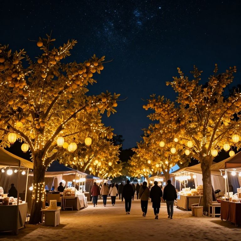 Night market scene: illuminated orange trees, glowing lanterns, people walking, outdoor food stalls, starry sky, warm and inviting ambiance. Photograph.