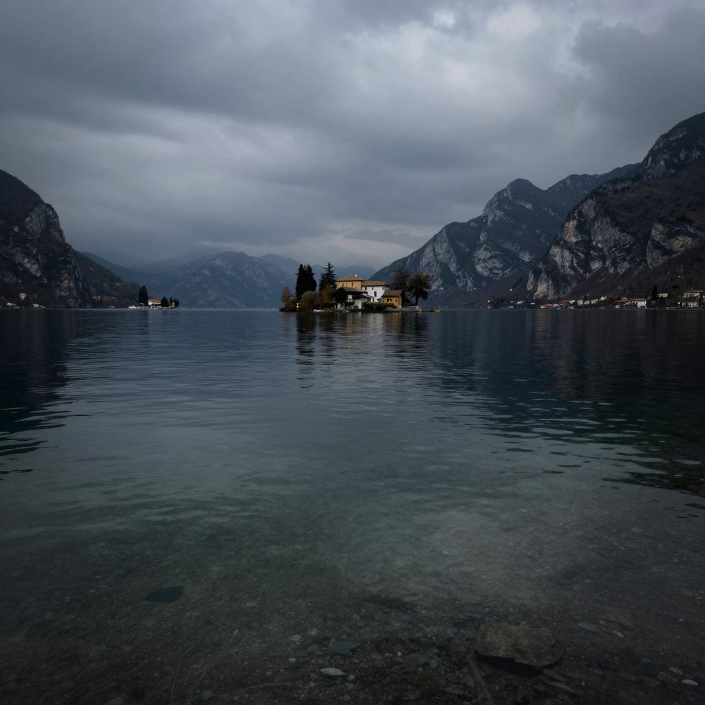 Glacier Lake Garda, the largest lake in Italy, is dotted with several picturesque islands. The crystal-clear water of the lake reflects the surrounding mountains, creating a breathtaking view. As you venture deeper into the lake, the water becomes shallower, and the underwater landscape turns eerie and spooky. The photograph captures this surreal atmosphere, with the haunting islands in the background and the dark, murky water in the foreground. Shot by James Nachtwey on an iPhone 13, the photo style is a mix of cinematic and moody photography, with low-key lighting adding to the ominous vibe of the scene.,