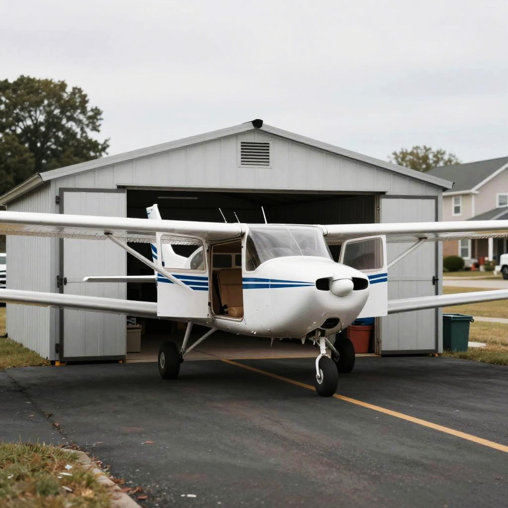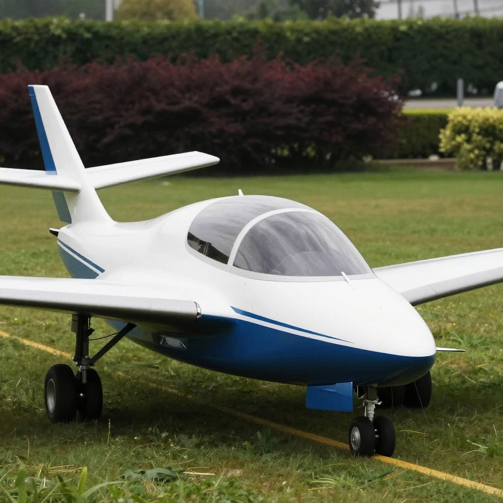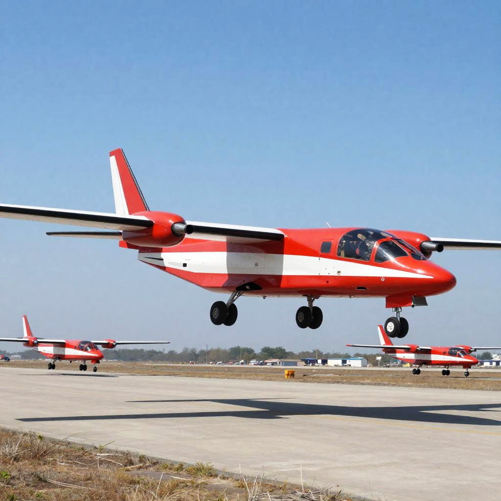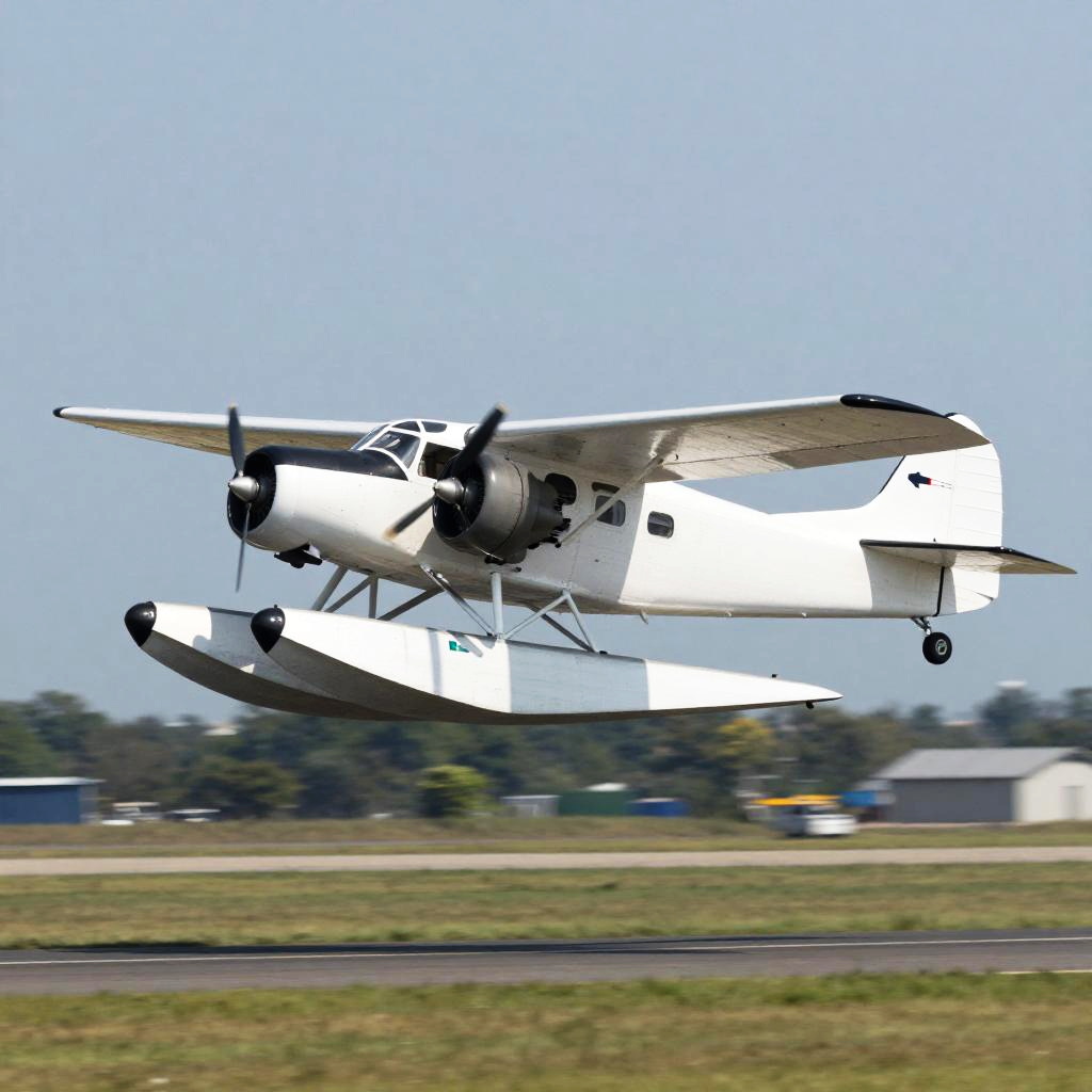 A digital image shows a black and red seaplane with pontoons, flying low over a calm, blue lake with gentle ripples. In the background, there's a green, hilly landscape under a bright blue sky with some scattered white clouds. The seaplane is positioned slightly to the left, mid-flight, with its propeller clearly visible. The overall scene feels serene and picturesque.