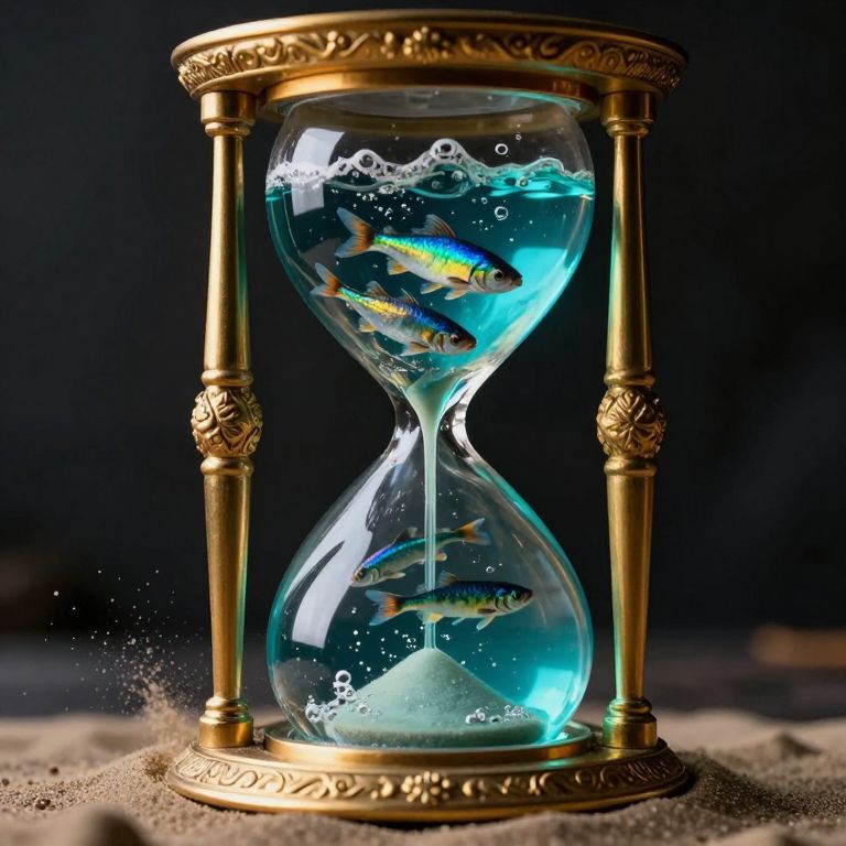 The image presents a surreal and intricate scene encapsulated within an hourglass, symbolizing the passage of time in an unconventional manner. The hourglass, with its ornate, golden frame and detailed carvings, stands prominently against a dark, shadowy background. Inside the hourglass, a swirling, turquoise-colored liquid flows, creating a sense of movement and fluidity. This liquid is not just a simple stream but a dynamic, almost living entity, with bubbles rising and waves crashing, suggesting a powerful force at play. Floating within this liquid are several fish, their scales shimmering in hues of blue and green, adding a touch of life and vitality to the scene. The fish seem to be swimming against the current, their paths intersecting and creating a sense of depth and complexity. At the base of the hourglass, a mound of sand rests, its texture contrasting with the smooth, flowing liquid above. The sand appears to be in a state of flux, with small particles scattered around, hinting at the constant movement and change that time represents. The overall composition is balanced yet dynamic, with the hourglass acting as the central focus, drawing the viewer's eye into the heart of the scene. The interplay of colors, from the deep blues and greens of the liquid and fish to the warm, golden tones of the hourglass, creates a visually striking and thought-provoking image.