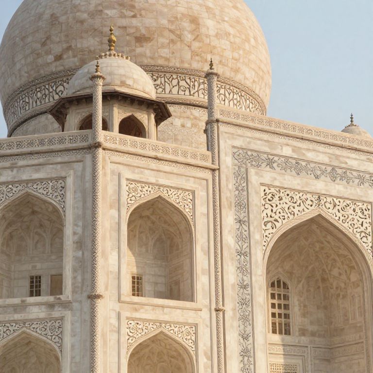 Photograph of a section of the Taj Mahal, an iconic white marble mausoleum in India. The image focuses on the upper part, showcasing intricate carved arches and detailed floral patterns. The central dome is large and rounded, with a smaller dome just below it. The marble is light beige with subtle shadows, highlighting the textures. The sky in the background is clear and blue, providing a contrasting backdrop to the detailed architecture. The photograph captures the elegance and symmetry of Mughal architecture.