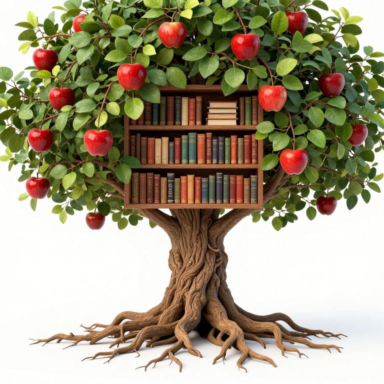 A whimsical digital illustration depicts a tree whose sturdy roots and gnarled trunk seamlessly transform into a bookshelf, adorned with rows of vintage books, while its lush green leaves and vibrant red apples symbolize knowledge and growth, blending the natural world with the realm of literature in a surreal, high-definition style.