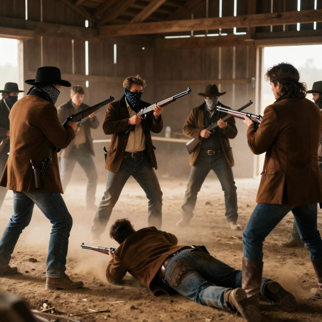 Photograph of a chaotic Western shootout in a wooden barn. Several men in brown coats and bandanas, some with rifles, face off in the center. One man lies on the ground in the foreground. Dust clouds the scene.