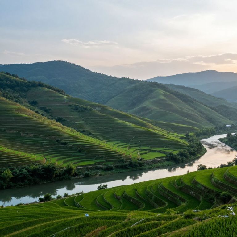 Terraced fields stretch endlessly beneath a soft morning sky, their vibrant green layers cascading down rolling hills, cradling a winding river that mirrors the tranquil beauty of the landscape.