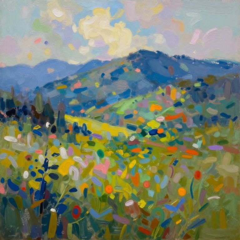 Painting photo filter applied to a serene landscape scene, vibrant colors enhanced with brushstroke textures, soft blending effects creating an impressionistic mood, intricate details highlighted under warm natural light, artistic style blending realism and abstraction.