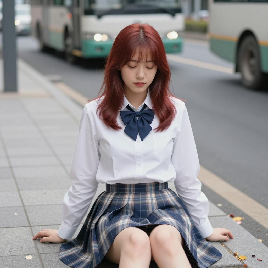 Japanese Schoolgirl Sitting on Concrete Ledge